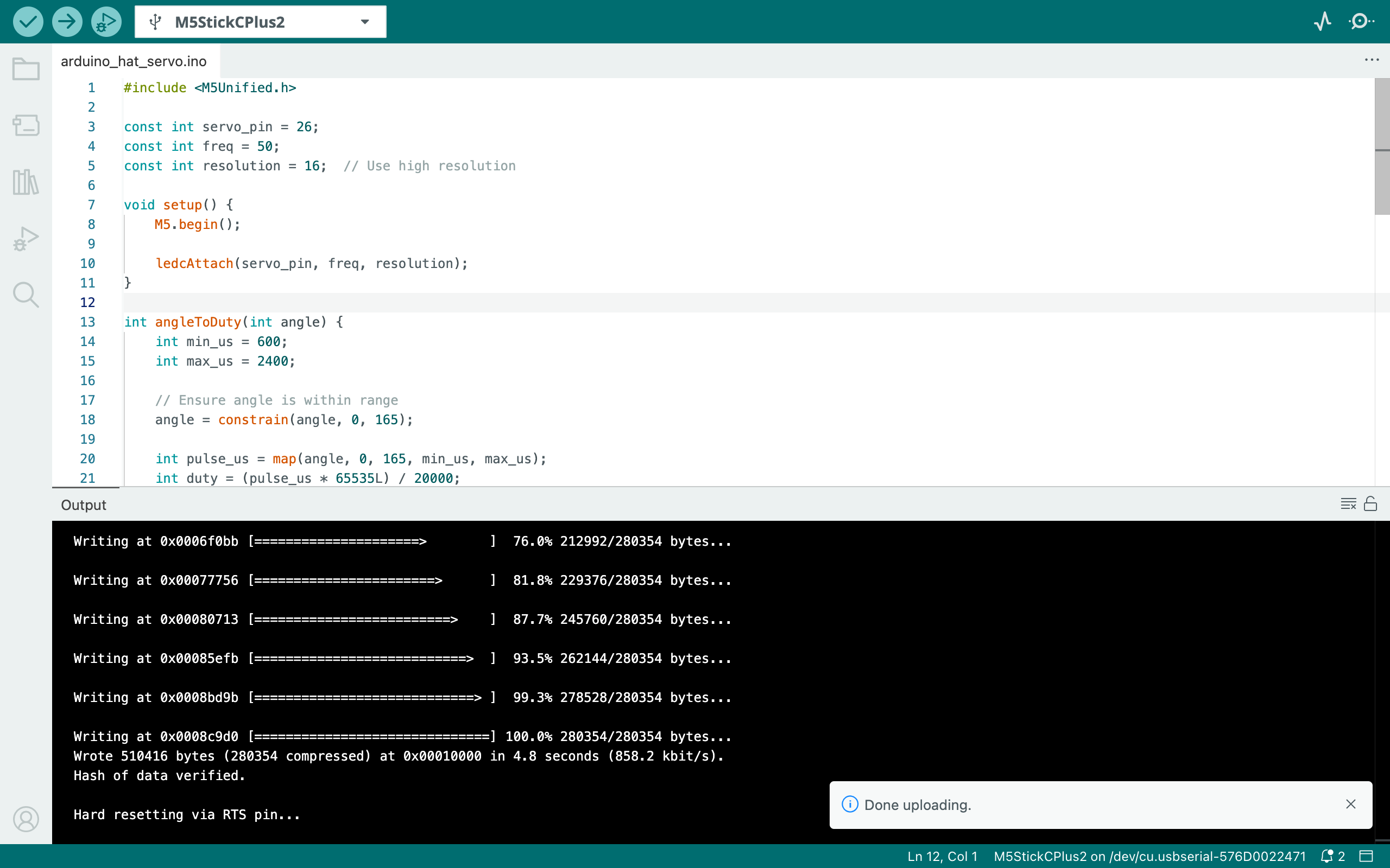 This program will control the rotation angle of the Hat Servo, and print the current angle and status information on the StickC-Plus2 screen and the computer's serial monitor: