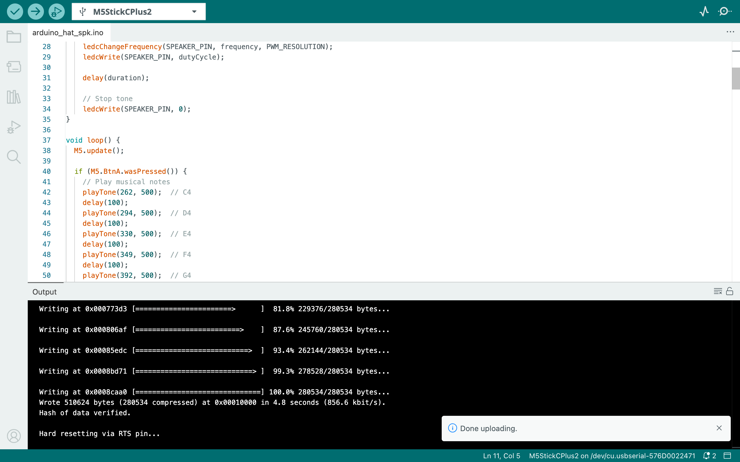 After the program detects that Button A is pressed, it will control Hat SPK to play audio. After the program is compiled and uploaded to the device, the StickC-Plus2 screen displays: