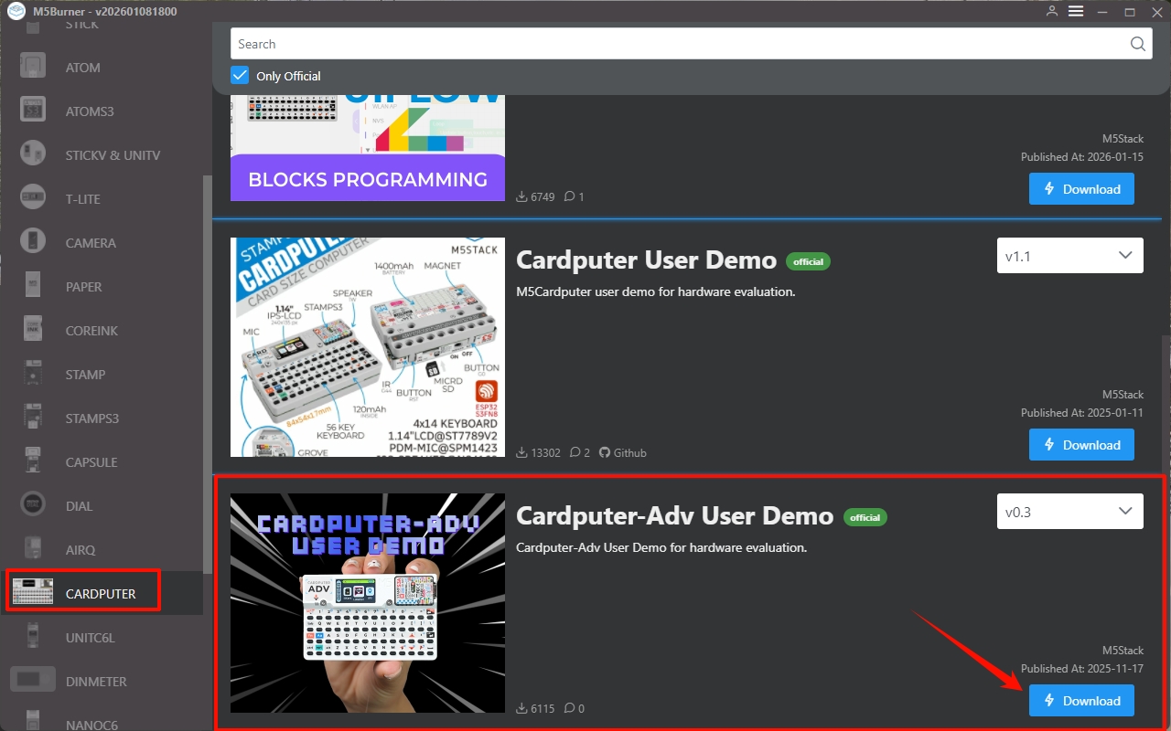 • Refer to the M5Burner tutorial to complete the download of the flashing tool, and refer to the figure below to download the corresponding firmware.