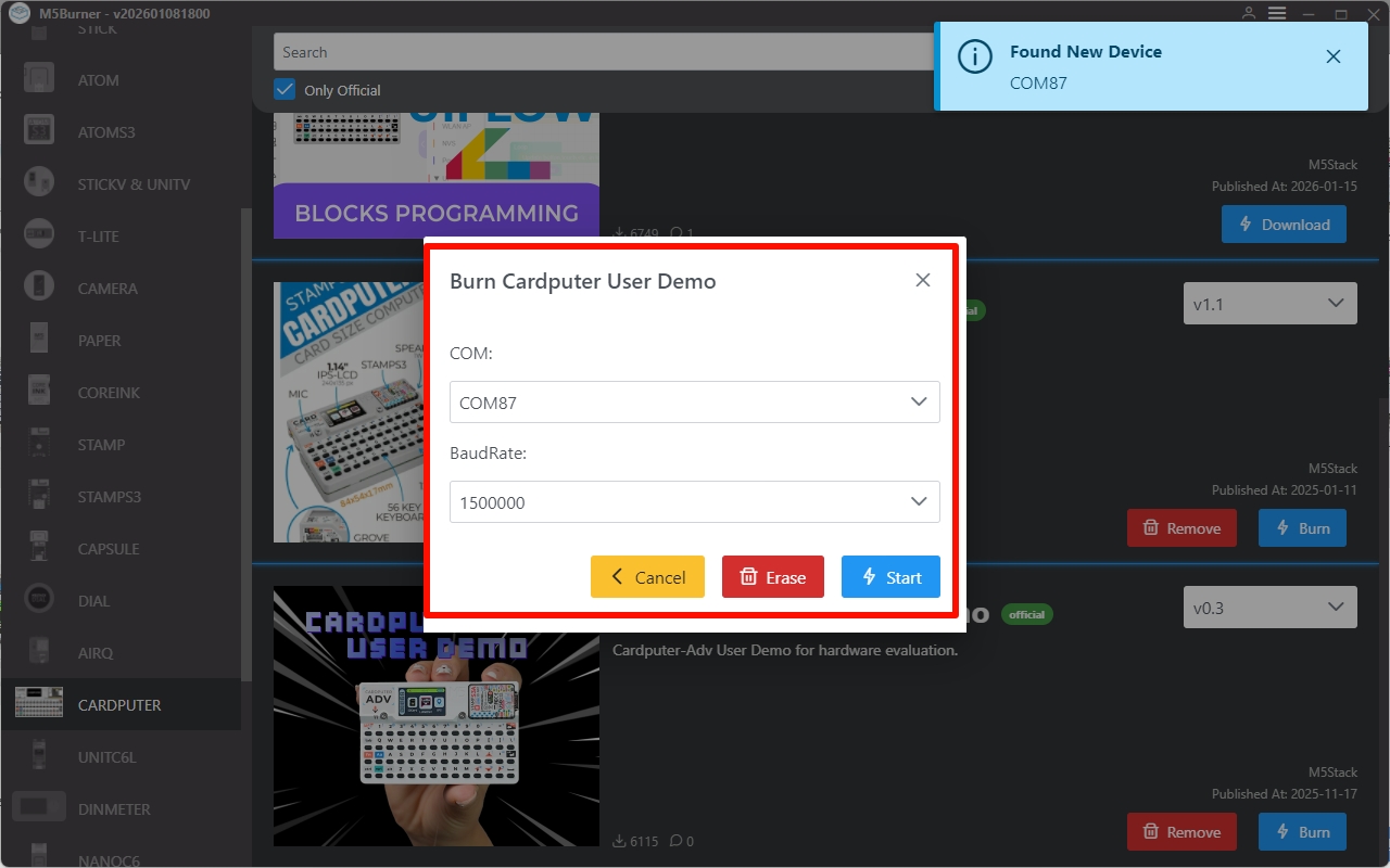 Connect the device to the computer via a USB cable. After the device enters download mode, select the corresponding device port in M5Burner.