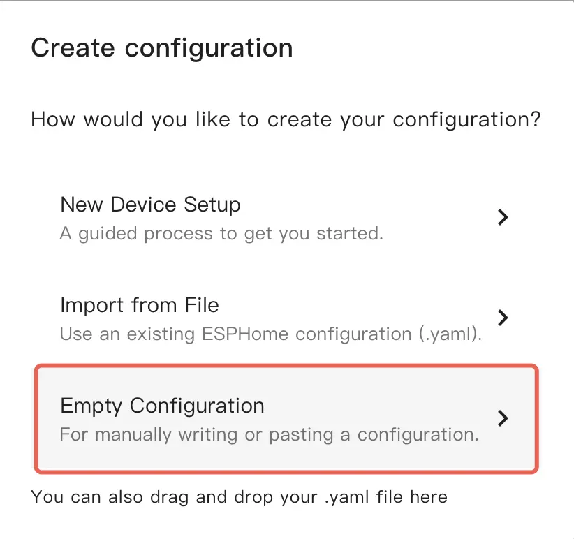2025.10.3. If you encounter build or upload issues, consider switching ESPHome to this version. Open ESPHome Builder in Home Assistant, create an empty configuration file.