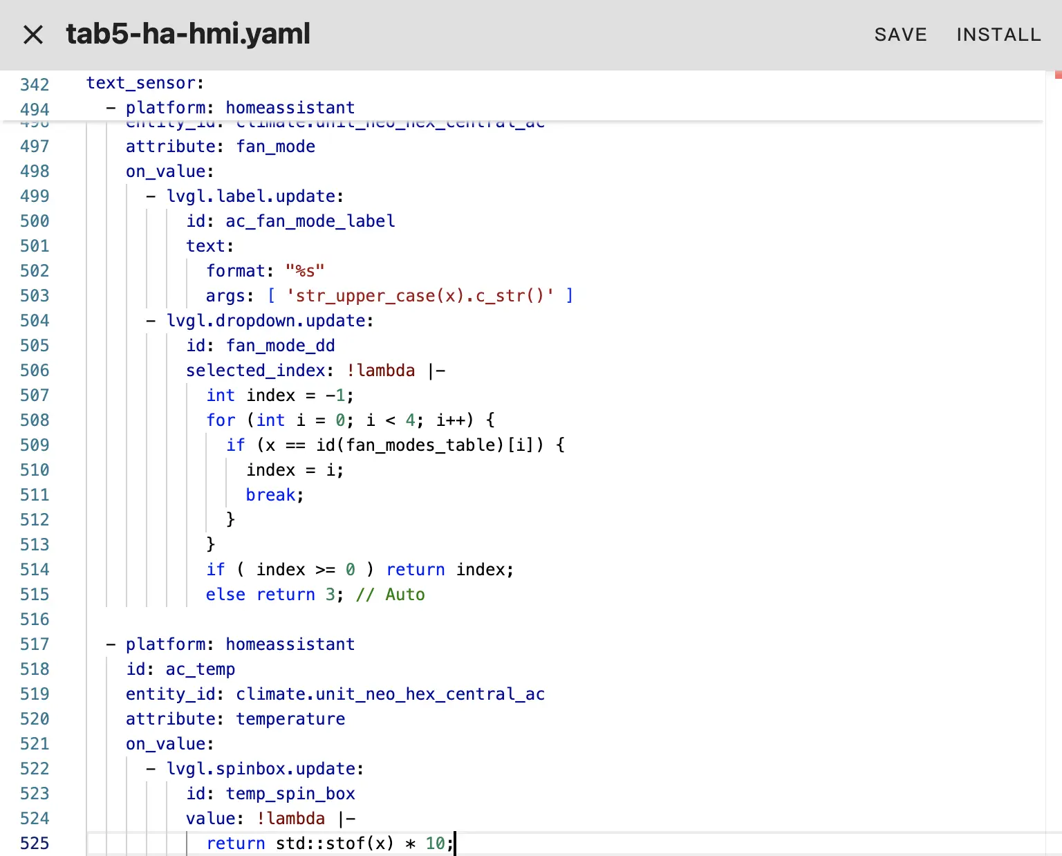 - lambda: id(set_ac_fan_mode)->execute(x);The control was encapsulated as a script, which was defined in tab5-scripts.yaml