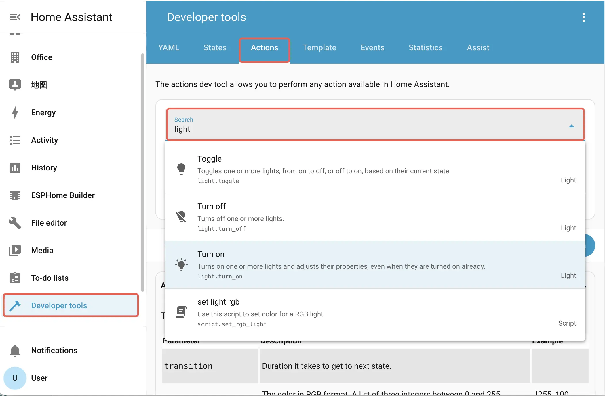 entity_id and attribute options in data node. To know which entity actions can be triggered, heat to Developer tools -> Actions in Home Assistant and search the entity. For example, search what actions a light entity support. And the RGB color settings were done by the Home Assistant script. Refer more: