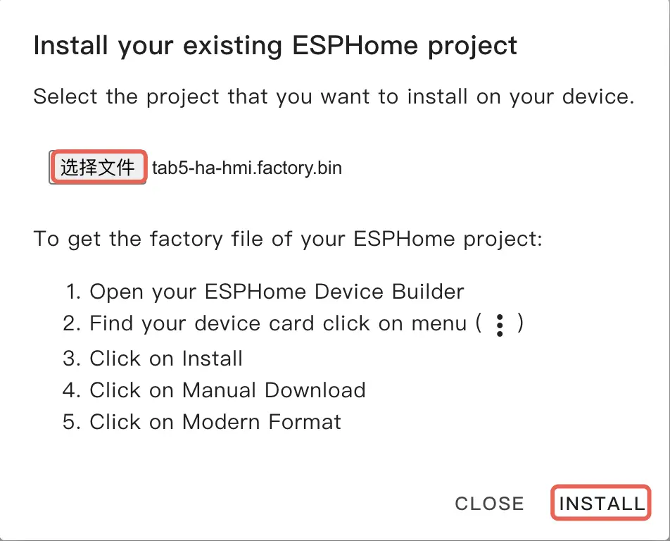 Then, click INSTALL and select the firmware previously downloaded. Hit INSTALL again, it will upload the firmware.