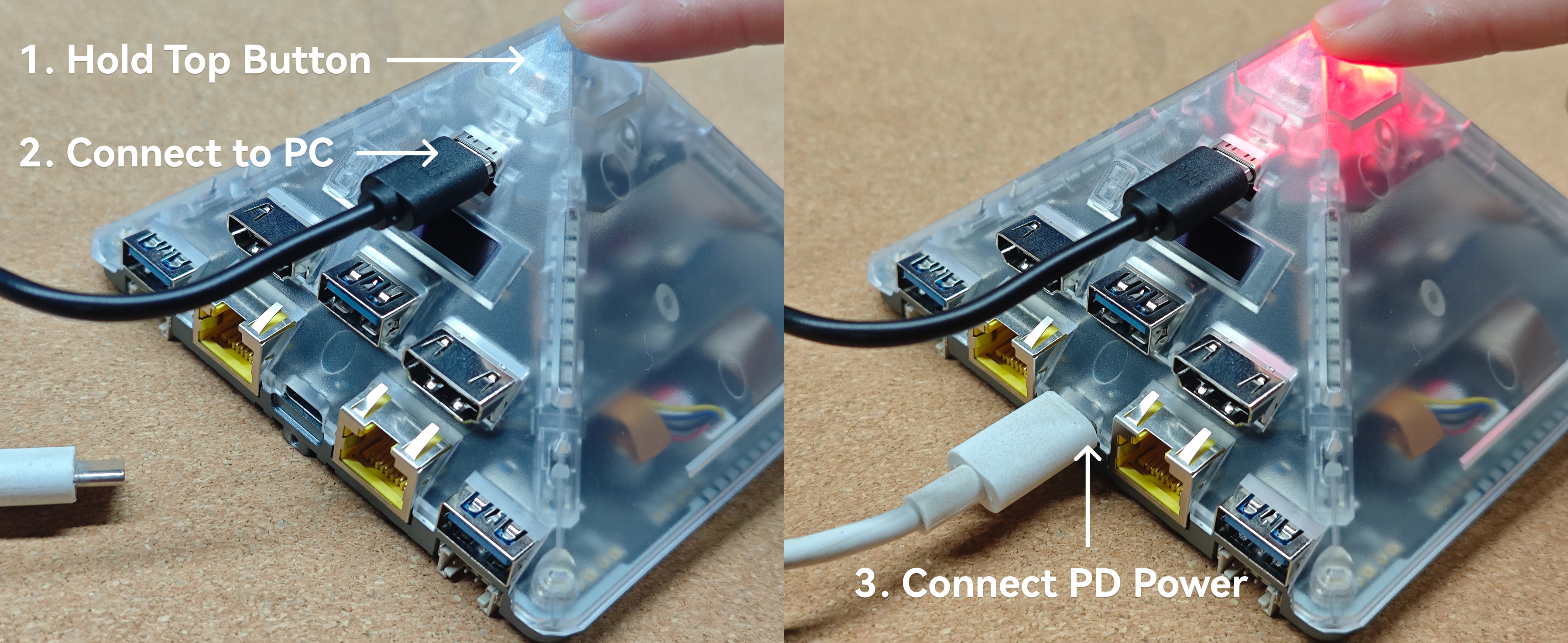 Connect the bottom USB PD power interface to power on the device. Note: Please use a PD power adapter. The device power requirement is DC 9V@3A (27W) or higher. Using DC 5V power will prevent the device from starting properly.